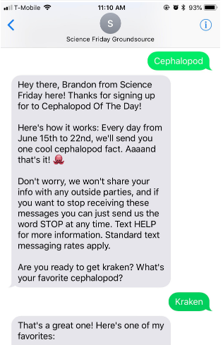 Science Friday’s goal for their Cephalopod Week 2018 content was to engage an audience outside of our regular social media fans, including a series of live events in cities around the country. But to get more people participating who may not be able to travel to the few cities in on the action, I developed an interactive SMS campaign, run through Groundsource, that shared a fact about cephalopods every day over the course of eight days (eight days, eight legs…get it?). The result was a highly engaged group of fans—92% of which said they learned something, 88% of which said they shared something they learned—with participants from from across the United States.